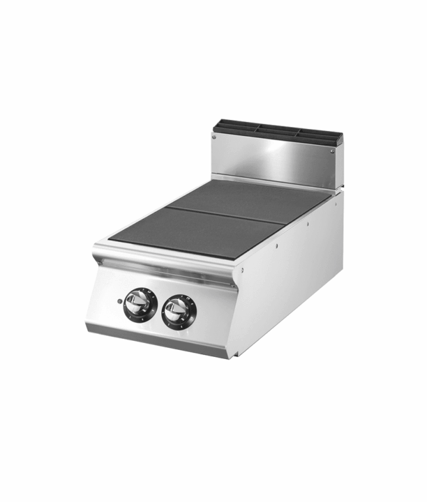 Fogão elétrico de bancada com 2 placas quadradas de aquecimento basculantes.