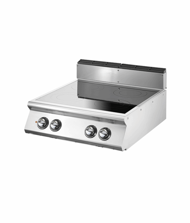 Fogão elétrico vitrocerâmico de bancada com 4 zonas de aquecimento.