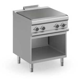 Nas versões com acionamento elétrico, a placa de cozimento, em aço macio com 15 mm de espessura, é única, mas possui 4 zonas de cozimento com controle independente