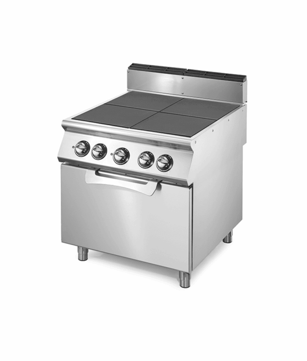 Fogão elétrico com 4 placas quadradas de aquecimento basculantes e forno estático.