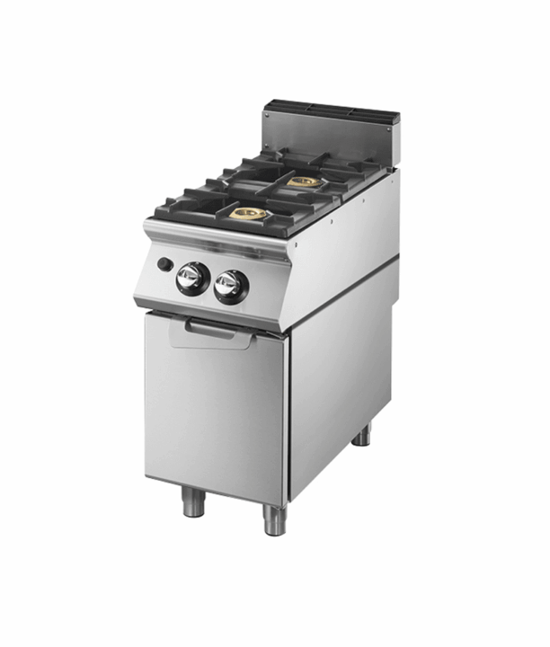 Fogão a gás com 2 queimadores sobre base neutra com porta.