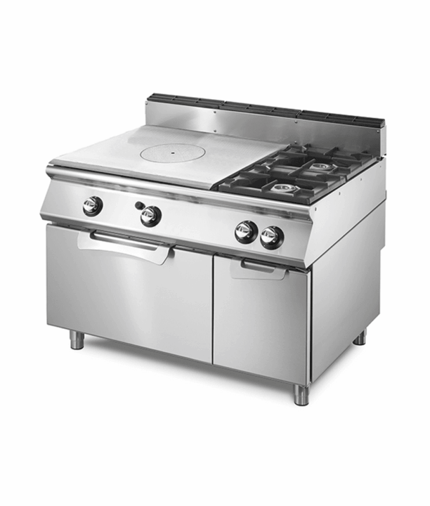 Fogão a gás com 2 queimadores, placa radiante, base neutra e forno.