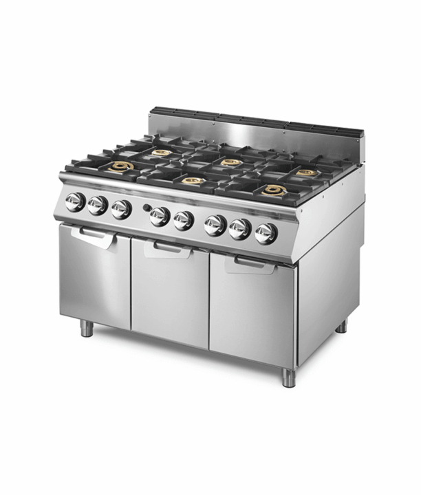 Fogão a gás de alto rendimento com 6 queimadores (3x 6kW + 3x 16kW) e base neutra com portas.