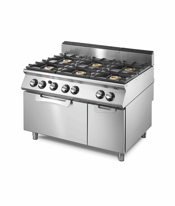 Fogão a gás com 6 queimadores, base neutra e forno elétrico.