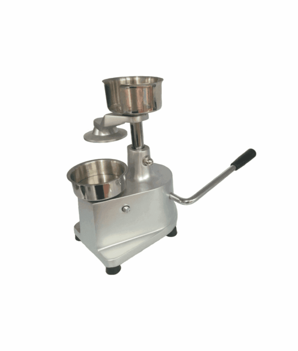 Formadora manual de hamburgeres com Ø100mm, dotada com estrutura em aluminio anodizado e aço inox.