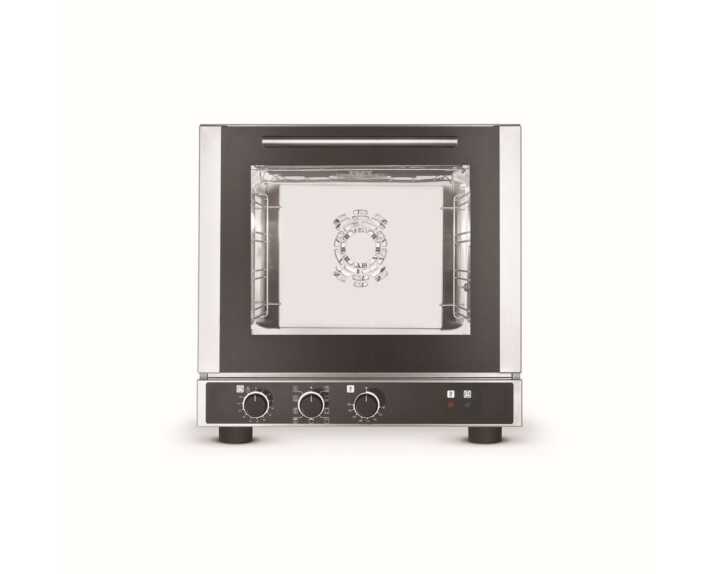 Forno com 8 opções de cozedura; Camara de cozedura em aço inox AISI430; Porta com vidro inspeccional; Guarnição embutida; Control de temperatura por termóstato; Painel electromecânico; Com 1 motor unidireccional; Empilhável; Incluí 4 tabuleiros(429×345)