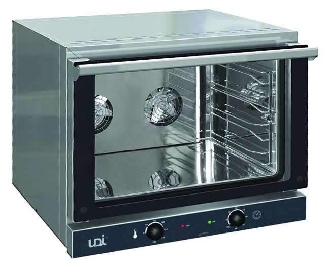 Forno convector eléctrico com comandos manuais; Em aço inox; Termostato 280ºC; Temporizador 60 minutos; Com dois motores e dois ventiladores; Luz interior;