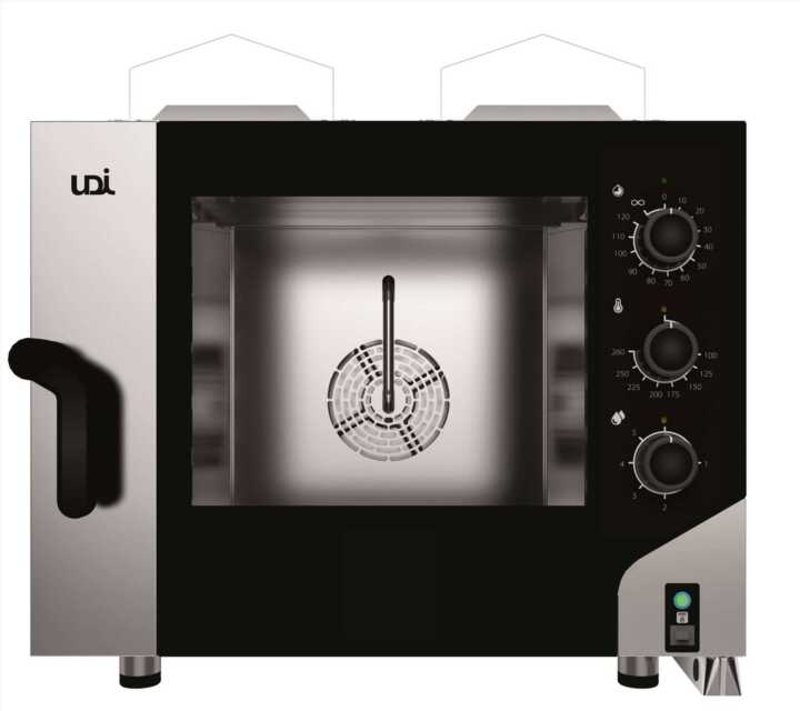 Forno a gás combinado 4 tabuleiros GN 1/1 ou 600 x 400 mm com painel eletromecânico e possibilidade de sobreposição. Qualidade num forno simples e eficiente.