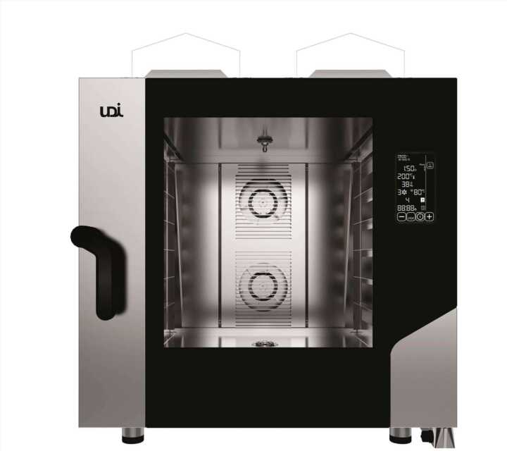 Forno a gás combinado 6 tabuleiros GN 1/1 ou 600 x 400 mm com painel digital Touch. Qualidade num forno eficiente. Pode configurar até 100 receitas da maneira mais fácil e imediata possível e configurar até 10 etapas de cozedura.