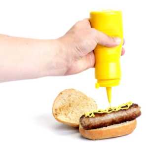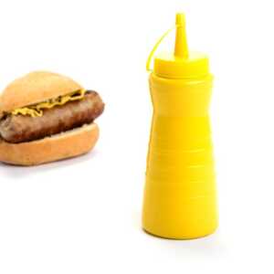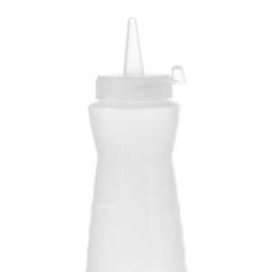 A pequena abertura garante que o molho não verte quando o frasco está invertido.