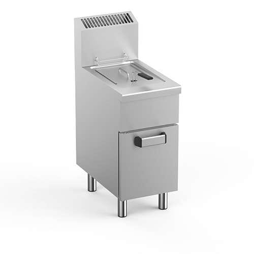 Zona inferior da cuba com excelente isolamento térmico. Cuba com «zona fria» para o depósito de resíduos. Torneira de drenagem do óleo com sistema de segurança e gaveta para recolha do óleo.