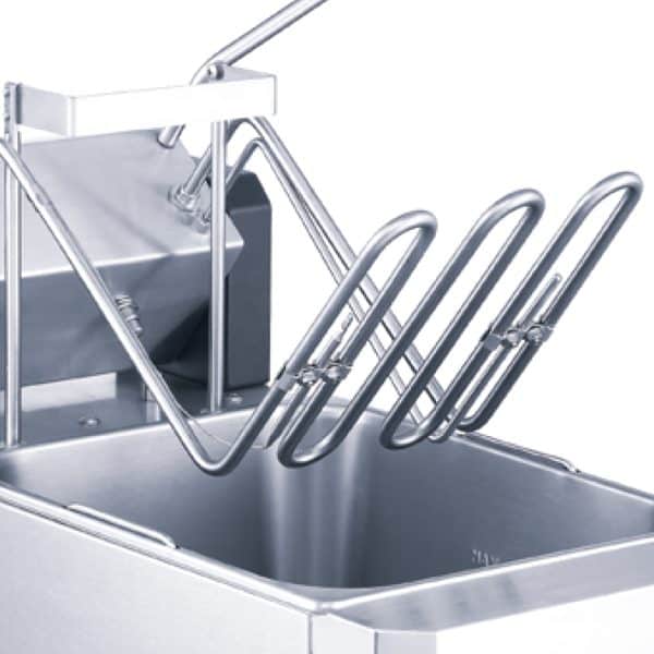 Além disso, a elevação automática dos cestos evita salpicos de óleo quente e reduz o risco de acidentes durante o manuseamento dos cestos.