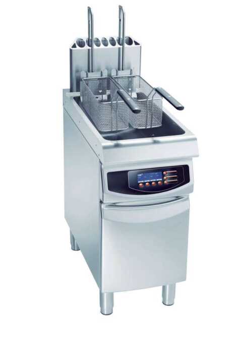 Estrutura em aço inox AISI 304 com painéis extraíveis ; Cuba de cozedura monobloco embutido em profundidade sem soldaduras em aço inox AISI 304, com zona fria extensa ; Sistema de resistências blindadas elevatórias com fixação automática para facilitar a limpeza da cuba; Sonda de temperatura; Filtro no interior da cuba; Área de armazenamento espaçosa para evitar derramamento de óleo; Sistema de aquecimento eléctrico com modulação de potência, tanto fase de aquecimento inicial como na fase de aproximação da temperatura final ; Este sistema permite o uso da potência máxima para grandes quantidades de produto ou potência reduzida para pequenas quantidades de produto, reduzindo o consumo de electricidade; Painel electrónico LCD “Easytouch” com controle simples e imediato das seguintes funções: 12 ciclos de cozedura personalizada; Memorização do ciclo precedente; Ciclo “ Melting” automático controlado na fase inicial; ciclo automático de lavagem da cuba; Sistema de autodiagnóstico; Incluí 2 cestos.