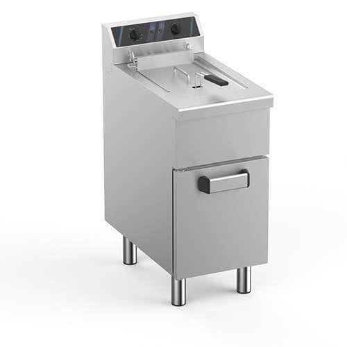 Zona inferior da cuba com excelente isolamento térmico. Cuba com «zona fria» para o depósito de resíduos. Torneira de drenagem do óleo com sistema de segurança e gaveta para recolha do óleo.