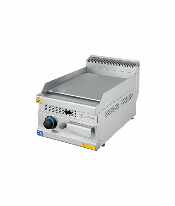 Fry-Top simples a gás com placa lisa, com estrutura em aço inoxidável, placa em aço cromoduro com igual distribuição da temperatura em toda a zona.