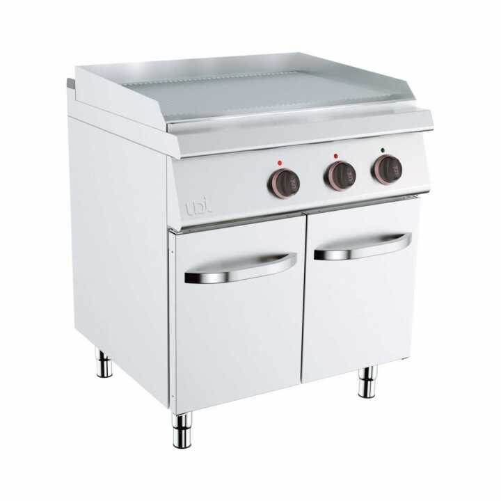 Versão ranhurada da superfície de cozimento. Frytop com armário inferior e porta. Espessura do Frytop de 15mm em aço ST 52. Área da superfície de cozimento em aço inoxidável com espessura de 3mm. Gaveta coletora de gordura em aço inoxidável localizada dentro do armário. Superfície de cozimento levemente inclinada para facilitar e confortável na limpeza. Possui orifício para escoamento de líquidos. Recipiente para coleta de óleo residual. Sistema de segurança com termopar conectado ao queimador. Acionamento dos queimadores por meio de ignição piezoelétrica. Temperatura operacional: 50-300°C.