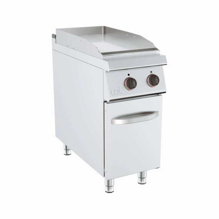 Superfície de cozedura suave Armário com portas Grelhas de aço ST 52 com espessura de 15 mm Superfície de cozedura de aço inoxidável com espessura de 3 mm Gaveta de coleta de óleo de aço inoxidável no armário Superfície de cozedura inclinada para facilitar a limpeza Buraco de descarga de líquido para aquecimento uniforme na superfície de cozedura Tanque de óleo residual Sistema de segurança de termopar conectado ao queimador Queimador de ignição piezoelétrica Temperatura de operação: 50-300 °C