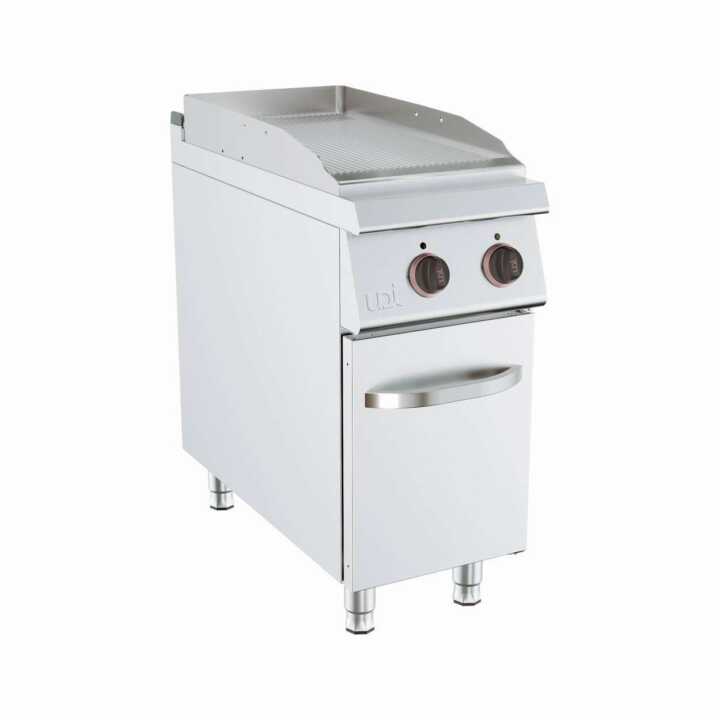 Frytop com armário inferior com porta, feito de aço st 52, com uma superfície de cozedura nervurada de 15 mm de espessura. A área da superfície de cozedura é feita de aço inoxidável com espessura de 3 mm e possui uma leve inclinação para facilitar a limpeza. Também possui um orifício para escoamento de líquidos, uma gaveta coletora de gordura em aço inoxidável, um recipiente de óleo residual e um sistema de segurança termopar ligado ao queimador. Os queimadores possuem acionamento piezoelétrico e a temperatura operacional varia de 50 a 300°C.