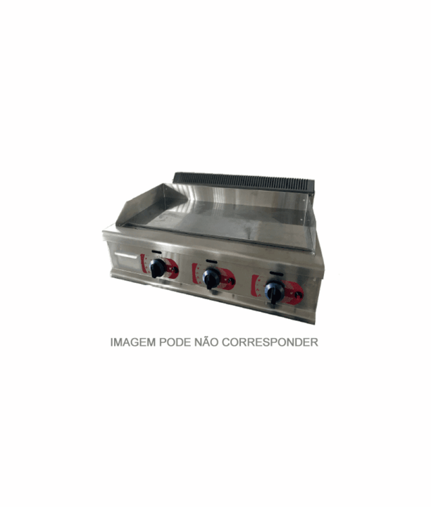 Fry-Top a gás de bancada com placa lisa, com estrutura em aço inoxidável e placa em ferro.