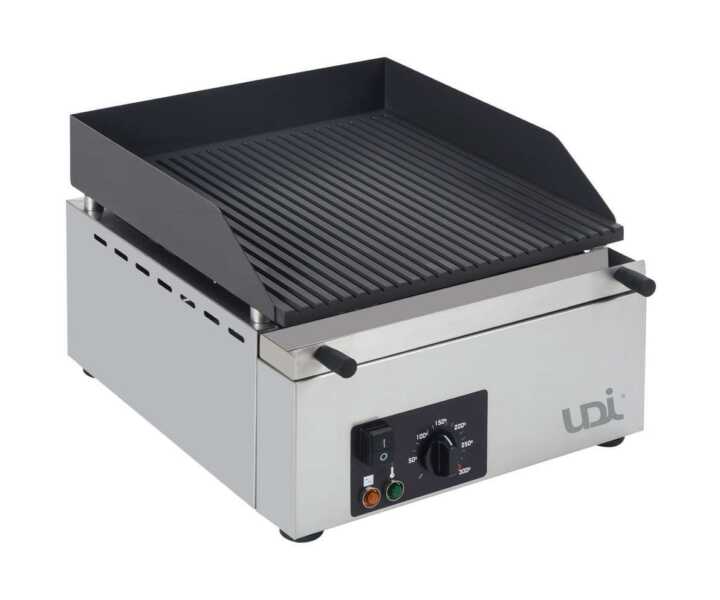 Estrutura totalmente em aço inox, disponível com gaveta para recolha de gorduras. Placa nervurada. Pés ajustáveis. Revestimento cerâmico para fácil limpeza e manutenção. Áreas independentes de cozedura (modelos 600 e 800). Alçado para proteção contra salpicos. Controlo de temperatura até 300ºC. Equipamento concebido e fabricado em conformidade com as normas EC.