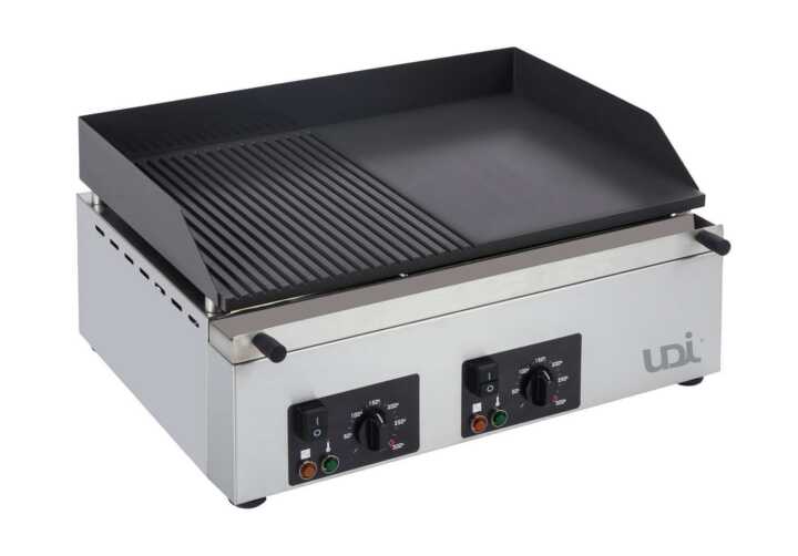 Estrutura totalmente em aço inox, disponível com gaveta para recolha de gorduras. 1 zona lisa e 1 zona nervurada. Pés ajustáveis. Revestimento cerâmico para fácil limpeza e manutenção. Áreas independentes de cozedura (modelos 600 e 800). Alçado para proteção contra salpicos. Controlo de temperatura até 300ºC. Equipamento concebido e fabricado em conformidade com as normas EC.