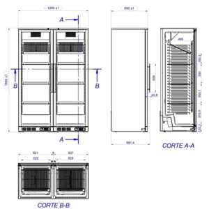 Com duas portas Seis prateleiras planas e duas prateleiras inclinadas em varão plastificado preto, o que lhe confere uma capacidade para 144 garrafas de 0,75cl