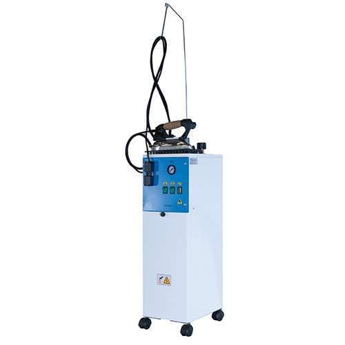 Gerador de vapor dotado de ferro, válvula regulável, dupla válvula de segurança, termóstato de segurança em caso de avaria, sinalizador de falta de água e manómetro de pressão.