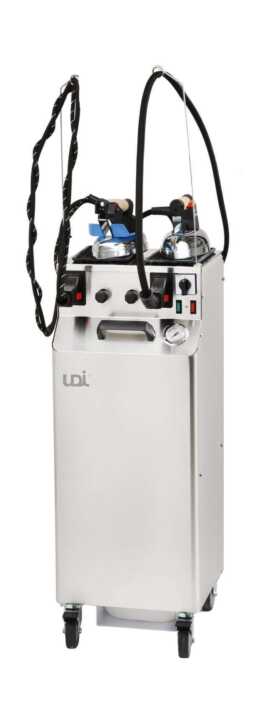 Gerador de vapor para engomar com duas estações de trabalho. A máquina pode ser conectada facilmente a ferros, pistolas a vapor, escovas a vapor e muitos outros acessórios.