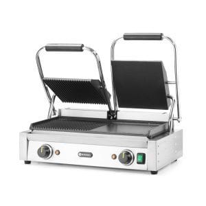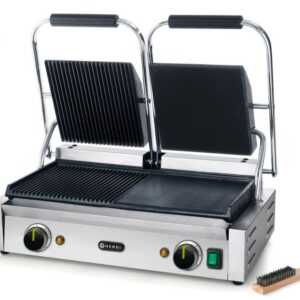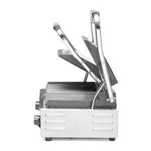 Levante o grelhador superior com a pega resistente ao calor e bloqueie-o em qualquer posição graças ao mecanismo de mola.