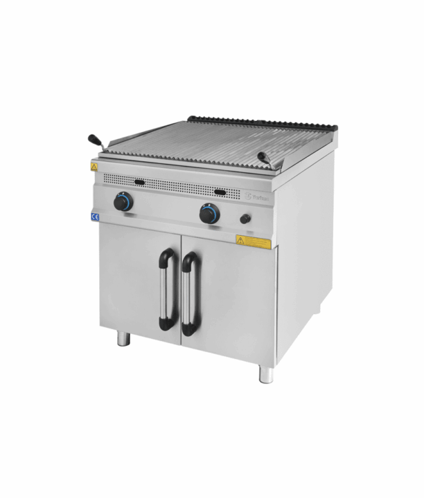 Grelhador de pedra lávica dupla a gás de chão, com estrutura em aço inoxidável, pés niveladores e válvula de segurança de gás.
