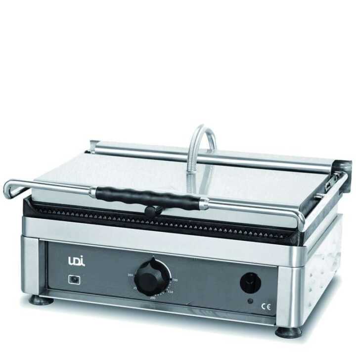 Grelhador duplo com uma unica prensa superior nervurado (placa superior e inferior) Aquecimento regular do calor em espiral em toda a superficie da placa