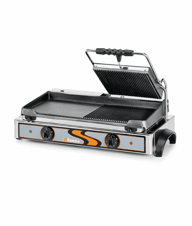 Grelhador / Tostadeira com placa inferior mista e 1 placa superior nervurada em ferro fundido.