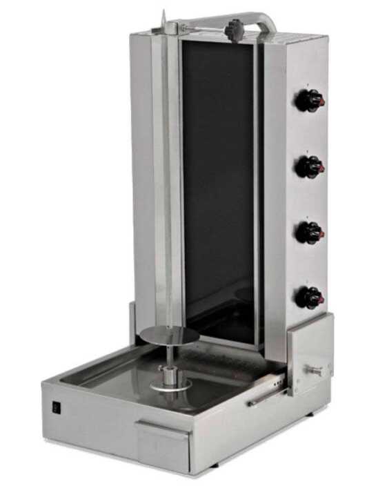 Máquina de gyros elétrico, com motor na parte inferior do equipamento,dois niveis de cozedura, estrutura em aço inox AISI304, de fácil manuseamento, rotação do espeto nos dois sentidos, espeto regulável, válvula de segurança magnética.