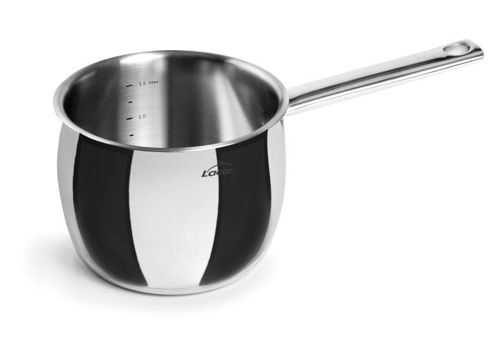 Caneca para cozinhado modelo Belly fabricado em aço inoxidável 18/10 com fundo termodifusor sanduíche adequado para placas de indução, elétricos, placas e fogões a gás.