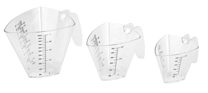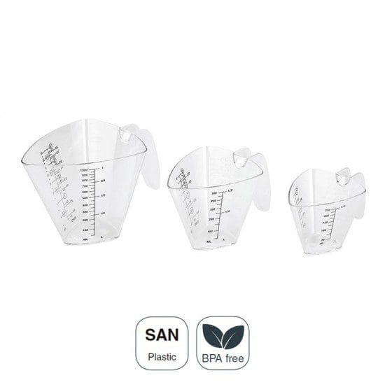 Jogo de 3 jarras medidoras de 250, 500 e 1000 ml de capacidade, ideais para bolos e fabricadas em plástico SÃO de uso alimentar livre de bisfenoles.