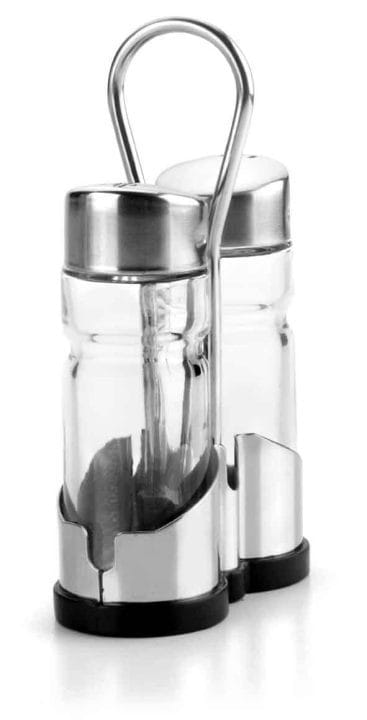 Jogo de saleiro e pimenteiro de 37,5 ml de capacidade por cada embarcação, fabricado em aço inoxidável e vidro.