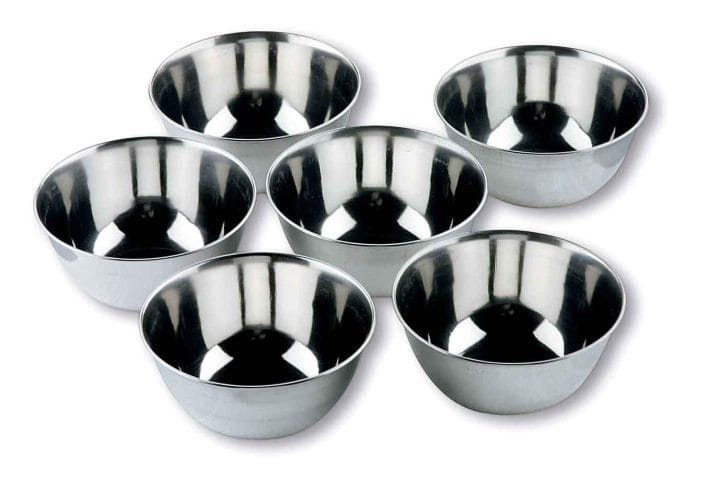 Conjunto de 6 bacias menores de 12 cm de diâmetro e 325 ml de capacidade, fabricados em aço inoxidável de alta qualidade e alta resistência à corrosão.