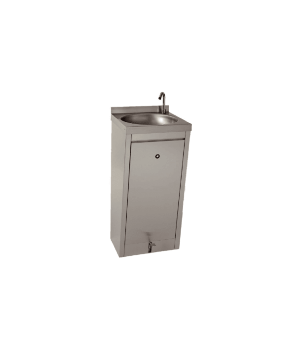Lava-mãos com estrutura em aço inoxidável, pio e pedal misturador.