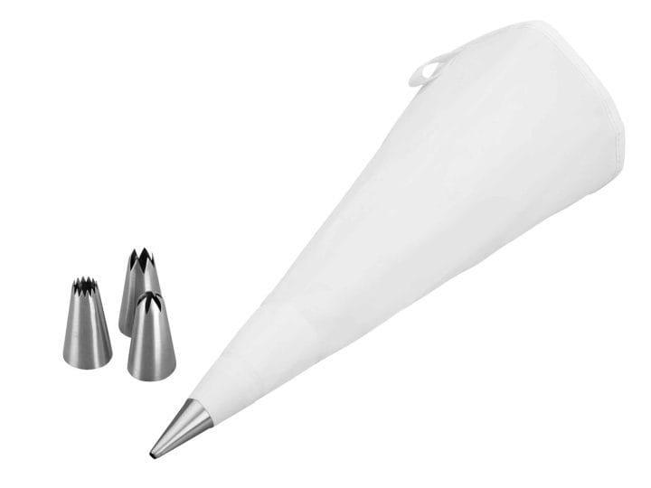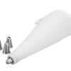 Saco de confeitar de 30 cm de comprimento com 4 bicos intercambiáveis 25×45 mm de diâmetro fabricadas em aço inoxidável de grande qualidade.