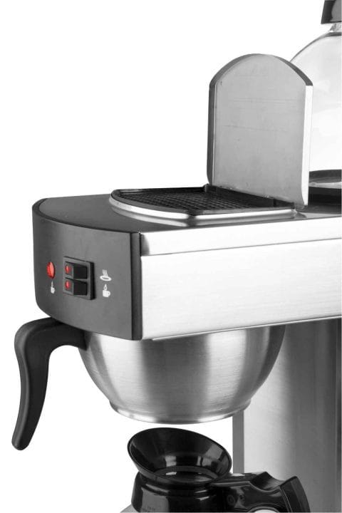 A máquina de café também inclui interruptores de funcionamento e aquecimento independentes, e um filtro de água na parte superior.