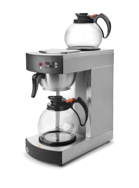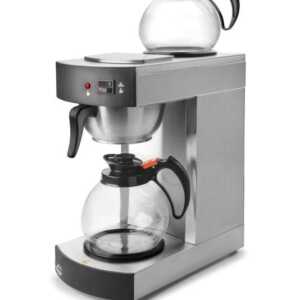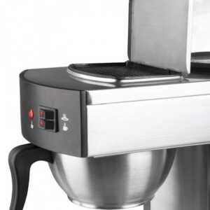 Cafeteira elétrica de gotejamento automática de 2100 W, fabricada em aço inoxidável 18/10 com 2 jarras de vidro de 1,8 litros de capacidade.