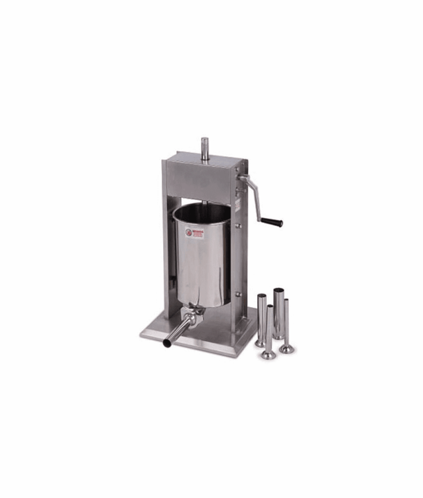 Máquina de encher enchidos manual vertical de 15L com estrutura em aço inoxidável. Ideal para produzir salsichas e enchidos Gourmet. Máquina de simples utilização e limpeza fácil.