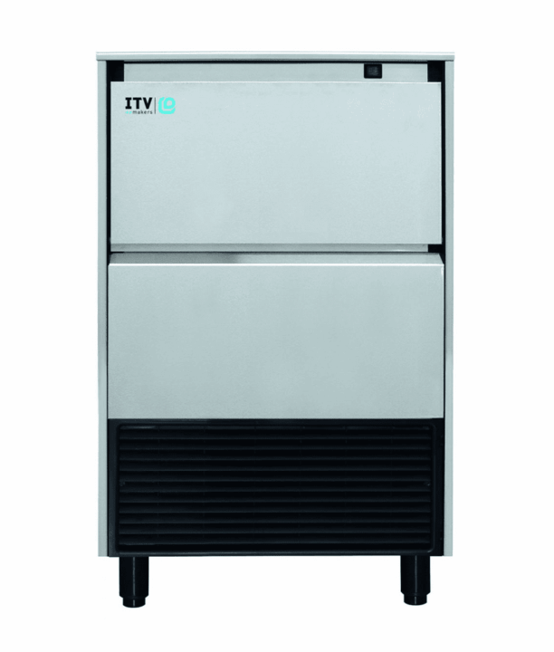 Máquina produtora de gelo em cubo com estrutura exterior em aço inoxidável AISI 304, interior do depósito em ABS com isolamento.