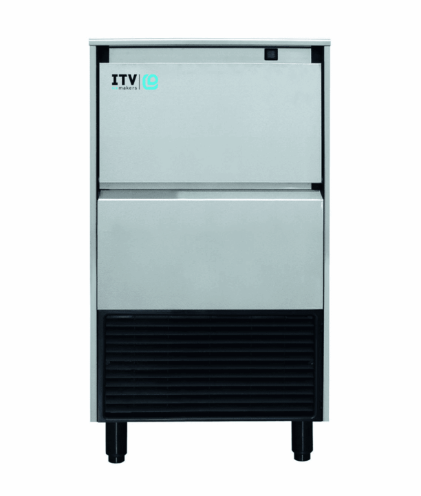 Máquina produtora de gelo em cubo com estrutura exterior em aço inoxidável AISI 304, interior do depósito em ABS com isolamento.