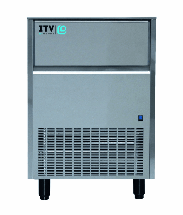 Máquina produtora de gelo em cubo com estrutura exterior em aço inoxidável AISI 304, interior do depósito em ABS com isolamento e sistema de refrigeração a ar.