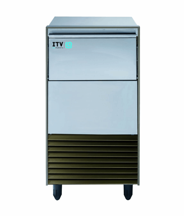 Máquina produtora de gelo em cubo com estrutura exterior em aço inoxidável AISI 304 em combinado com perfis em aluminio anodizado. Interior do depósito em ABS com isolamento.