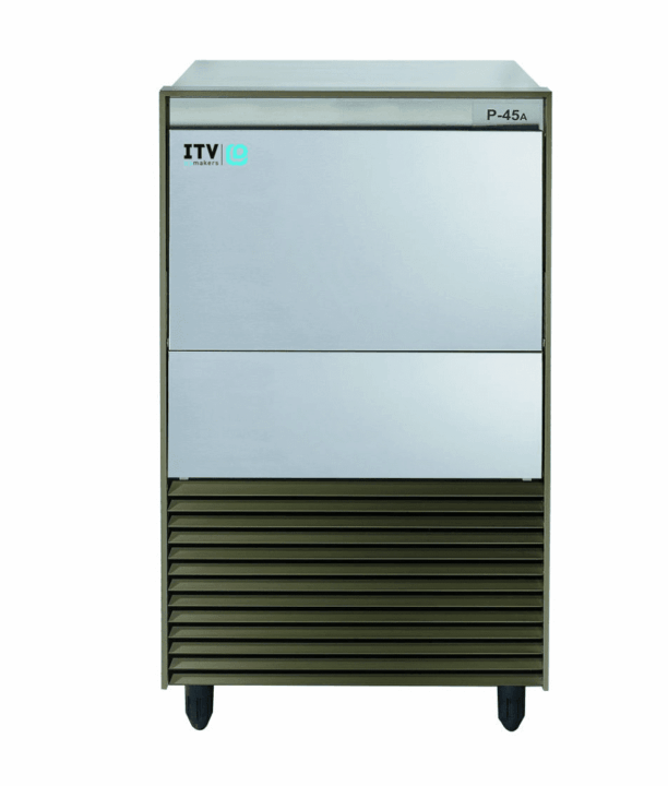 Máquina produtora de gelo em cubo com estrutura exterior em aço inoxidável AISI 304 em combinado com perfis em aluminio anodizado. Interior do depósito em ABS com isolamento.