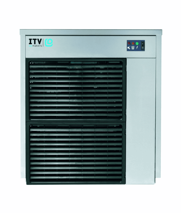 Máquina modular produtora de gelo granulado com estrutura exterior em aço inoxidável AISI 304, interior do depósito em ABS com isolamento.