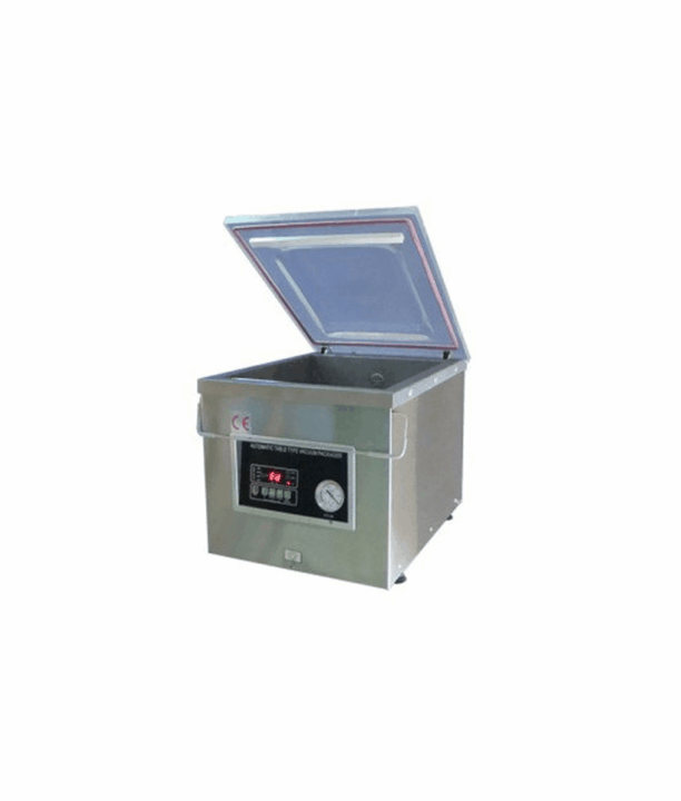 A Máquina embaladora a vácuo permite prolongar o tempo de conservação dos alimentos crus ou cozinhados, sem perda do peso, sem ficarem ressequidos, nem misturarem sabores e odores. Equipamento de colocação sobre mesa de trabalho.
