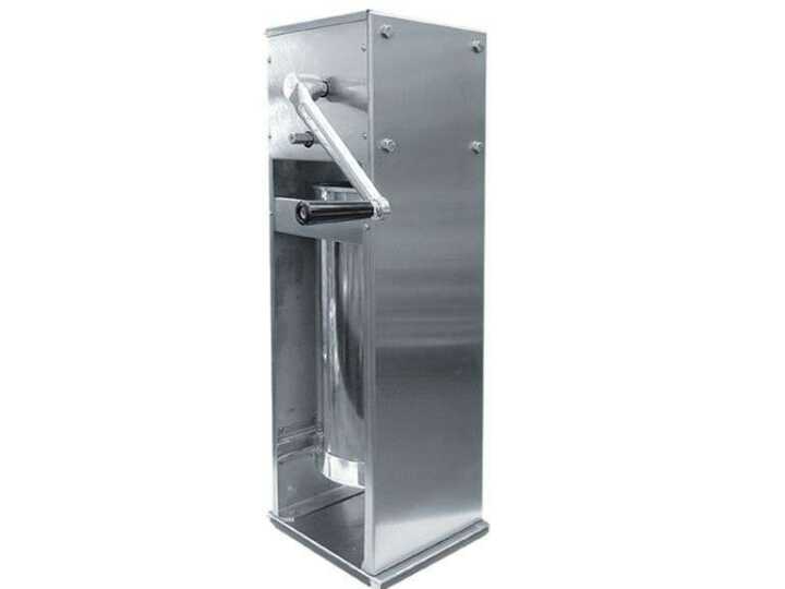 Excepcionalmente forte, muito fácil de ser manipulado e operado, é realmente o melhor para encher qualquer tipo de salsicha. O cilindro de aço inoxidável 18/8 AISI 304, o pistão de alumínio aprovado com acabamento especial, o suporte sólido, as engrenagens de precisão e a fabricação precisa de todos os detalhes mecânicos garantem um trabalho perfeito, a máxima eficiência e longa vida útil. Os enchimentos de salsicha têm duas engrenagens e estão equipados com três funis mutáveis para diferentes tipos de salsichas.